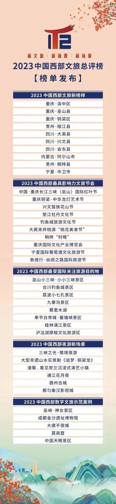 近日,以“新文旅、新消费、新场景”为主题的“第四届T12中国西部文旅发展峰会暨2023中国西部文旅总评榜颁奖典礼”在巫山举行。本次峰会由重庆市文化和旅游发展委员会指导,重庆日报报业集团、巫山县人民政府、T12中国西部旅游媒体联盟、西部陆海新通道报媒联盟等联合举办,重庆市文化和旅游发展研究会和西部12省区市媒体集团协办支持。 “2023中国西部文旅总评榜”颁奖典礼与文旅峰会同步举行,五大奖项一一揭晓。重庆分别入选“文旅新榜样”3个、“最具影响力文旅节会”5个、“最受国际关注旅游目的地”3个、“夜游新场景”3个、“数字文旅示范案例”1个。