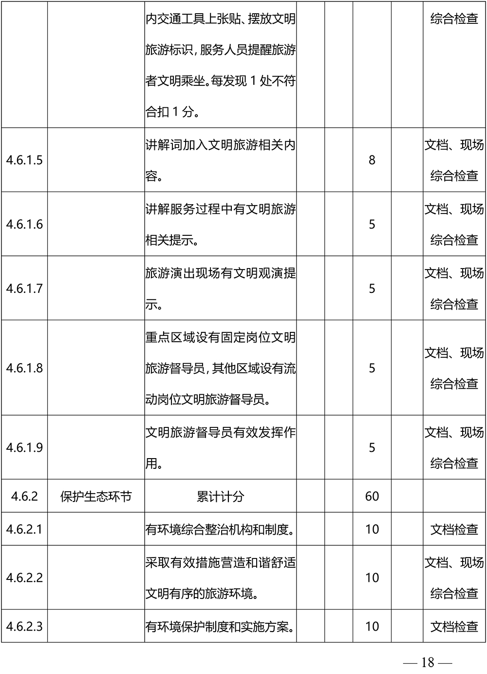 5.打分方式:文档检查项目采用得分方式,检查可以作为得分支撑的图片、视频、文件、新闻报道等材料;文档、现场综合检查项目采用先文档检查得分,再现场检查减分方式;现场检查项目为减分方式;加分项目为加分方式。《文明旅游负面清单管理措施》实行承诺制,检查发现问题,按照惩戒办法执行。