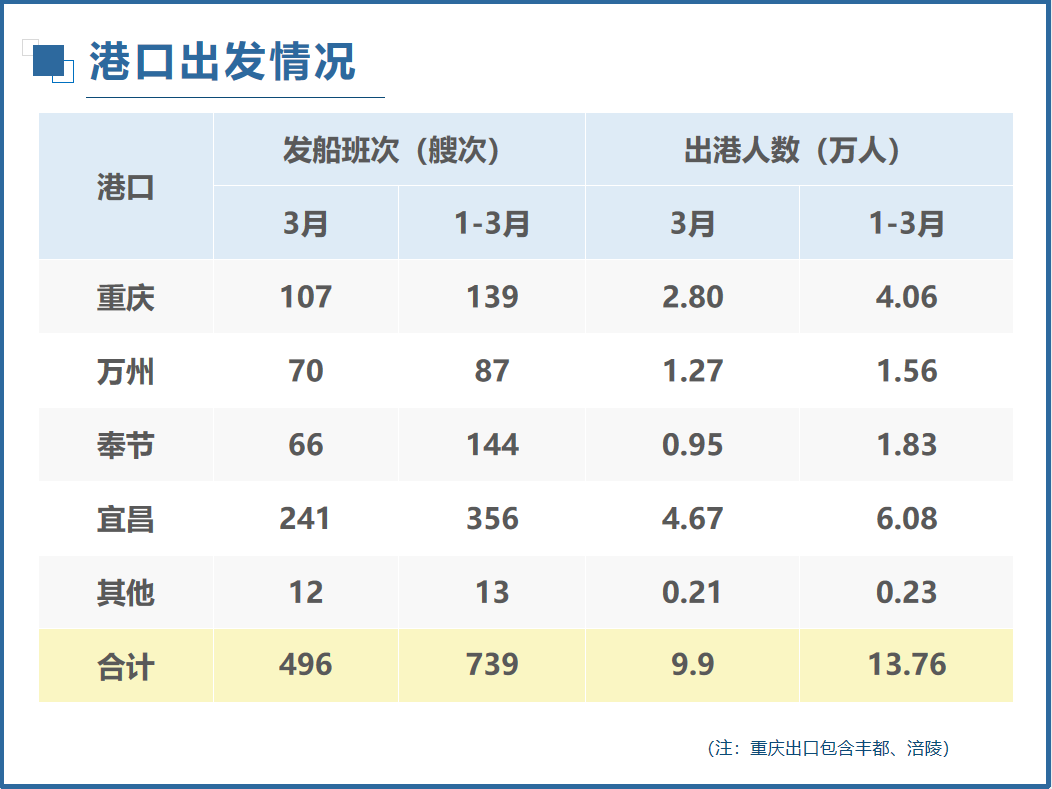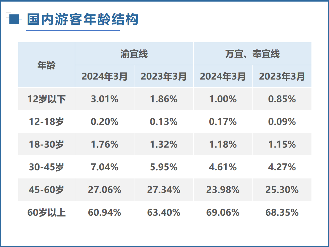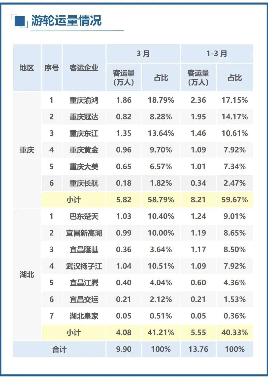 2024年3月,长江三峡游轮发船496艘次,为2023年同期的109.26%,为2019年同期的98.02%;完成客运量9.9万人,为2023年同期的78.82%,为2019年同期的105.54%;游轮平均负载率(床位)为63.07%,较2023年同期下降28.11个百分点,较2019年同期下降3.81个百分点 。