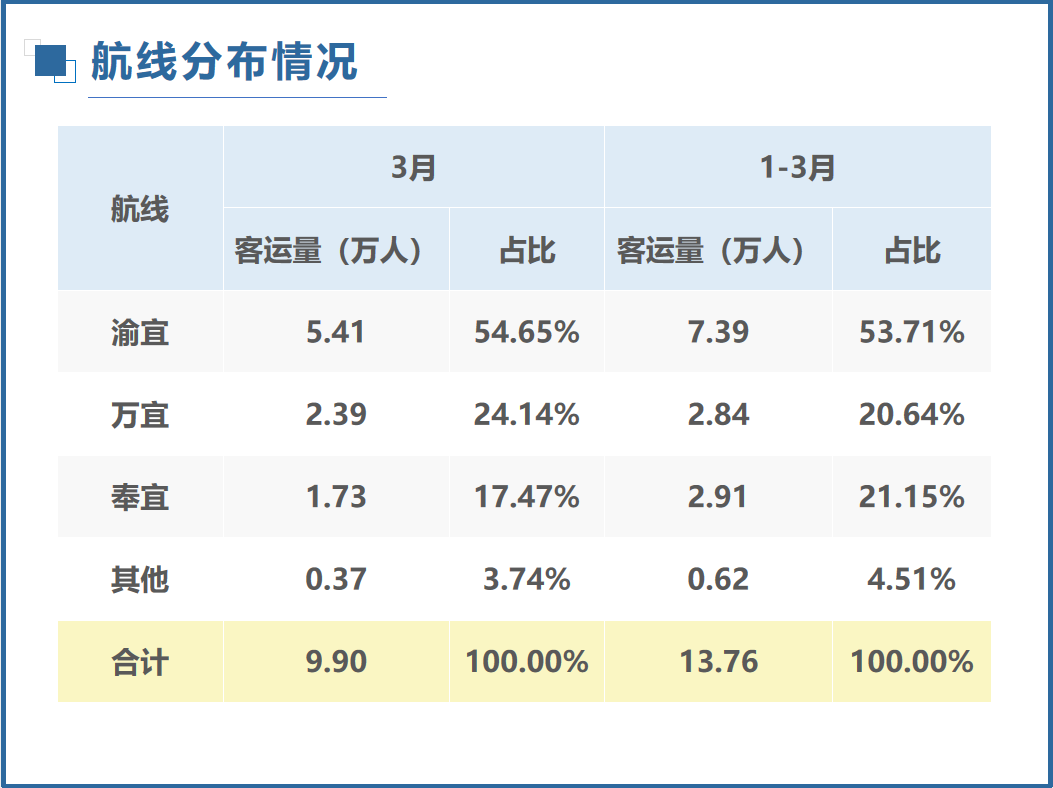 从游轮航线情况看,2024年3月,渝宜线(重庆-宜昌、宜昌-重庆)共计发船206艘次,接待量5.41万人,占总量的54.65%;万宜线(万州-宜昌、宜昌-万州)发船136艘次,接待量2.39万人,占总量的24.14%;奉宜线(奉节-宜昌、宜昌-奉节)发船131艘次,接待量1.73万人,占总量的17.47%。其他航线发船23艘次,接待量0.37万人,占总量的3.74%。