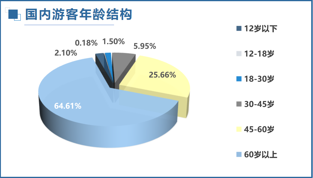 从游客年龄结构看,2024年3月, 60岁以上老年人群占总量的64.61%;45-60岁的人群占25.66%;30-45岁的人群占5.95%;18-30岁的人群占1.5%;18岁以下未成年人及儿童占2.28%。